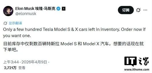4 月 9 日消息,埃隆 · 马斯克刚刚就特斯拉 Model S 与 Model X 库存问题抛出最新消息,随着公司逐步停产这两款旗舰车型,如今购买全新车辆的机会几乎所剩无几。