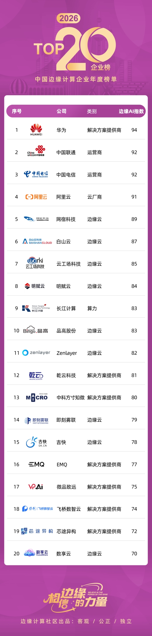 因此,从传播意义上看,“2026中国边缘计算企业20强”并不只是一次行业评选,更可以视作一份中国AI产业基础能力图谱中的重要样本。它呈现的不只是边缘计算赛道的竞争格局,更体现了中国企业在AI时代围绕算力、连接、平台、数据和场景所展开的全面布局。
