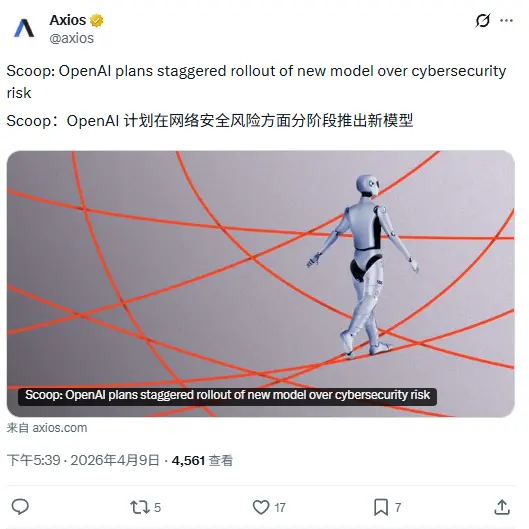 4 月 9 日消息,知情人士向 Axios 透露,OpenAI 正在完善一款具备高级网络安全能力的模型,但计划仅向一小部分公司开放,这一做法与 Anthropic 此前对 Mythos 模型采取的限制性发布类似。