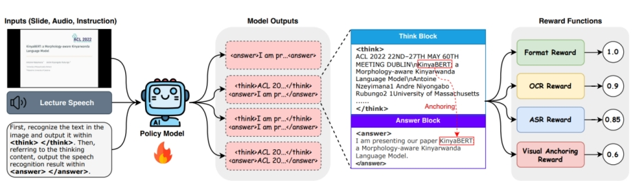 针对该问题,本文提出视觉锚定策略优化方法(VAPO),其核心在于模拟人类听取专业报告时的“先看后听”感知流程,通过思维链格式,将视觉感知与语音转录在时序上解耦:首先提取幻灯片文本作为视觉语义先验,随后以视觉先验作为锚点辅助完成语音识别。本文设计了涵盖格式、OCR、ASR、视觉锚定四类奖励函数引导模型的学习。同时,为解决现有数据专业实体密度低的问题,构建了包含合成数据集与真实数据的SlideASR-Bench基准。实验结果表明,VAPO能够有效消除全模态大模型的视觉干扰问题,在 SlideASR-Bench 及 SlideSpeech 等数据集上刷新了 SOTA 性能,并显著降低了领域专业实体的识别错误率。