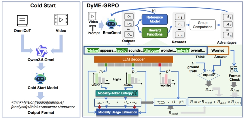 针对这一难题,我们提出 EmoOmni 模型。该模型创新性的引入了 OmniCoT 数据构建范式,通过“引导标识符(Guided Tokens)”构建认知锚点,强制模型在时序上分步提取并整合视觉、音频与文本特征,实现逻辑严密的链式推理。此外,我们提出了 DyME-GRPO 动态模态熵优化算法,通过强化学习手段动态校准模型对不同模态的依赖度,彻底解决模态失衡问题。实验表明,EmoOmni 在多项情感基准测试中刷新了 SOTA 纪录,在保持通用交互能力的同时,实现了更深层、更鲁棒的情感洞察。