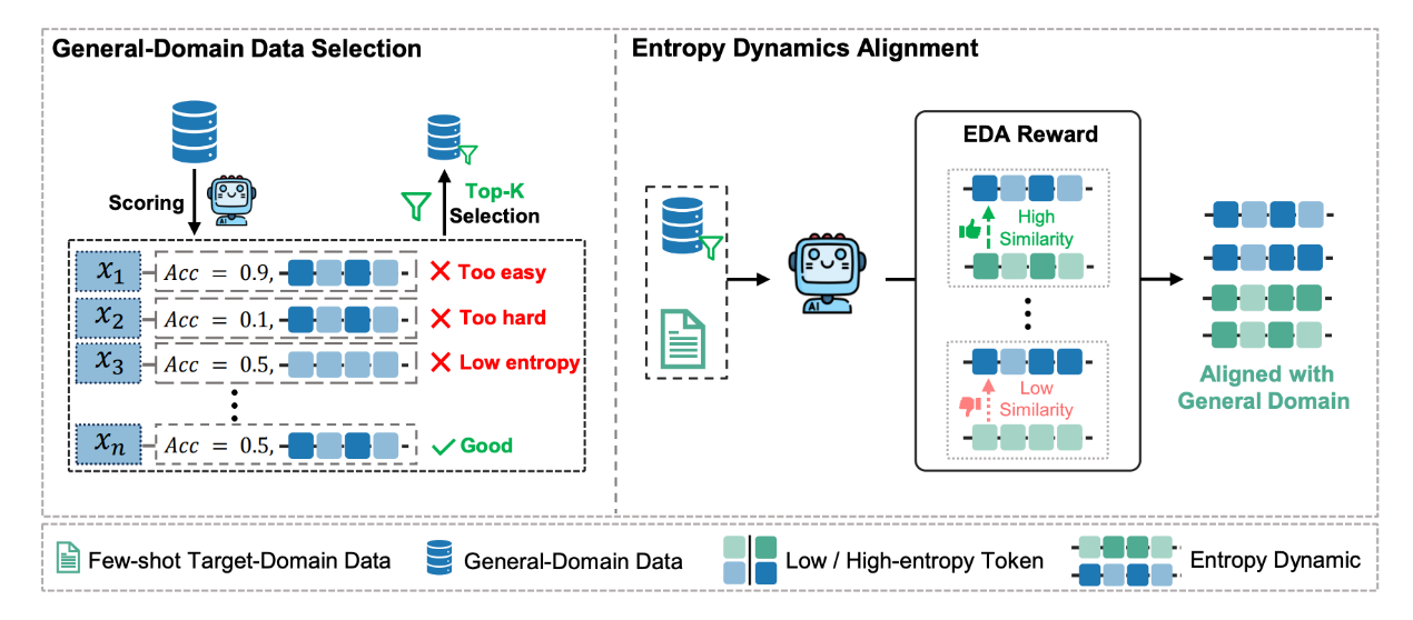 为此,我们提出混合域熵动态对齐(HEAL)框架,专为少样本 RLVR 设计。HEAL 首先有选择地融入高价值通用域数据,以促进更多样化的探索。随后,我们引入熵动态对齐(EDA)奖励机制,该机制能够对齐目标域与通用域之间的轨迹级熵动态,不仅捕捉熵的大小,还刻画其精细变化。通过这种对齐,EDA 不仅进一步缓解了熵坍缩,还鼓励策略从通用域习得更丰富的探索行为。跨多个领域的实验结果表明,HEAL 能够持续提升少样本 RLVR 的性能。值得注意的是,仅使用 32 条目标域样本,HEAL 即可达到甚至超越使用 1000 条目标域样本训练的全量 RLVR 模型水平。