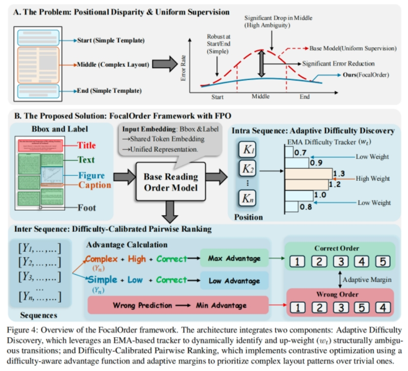 为解决上述问题,本文提出了 FocalOrder 框架,并设计了Focal Preference Optimization (FPO) 方法。具体而言,FocalOrder 通过结合指数滑动平均机制的自适应难度发现策略,动态定位难以学习的顺序转移关系;同时,引入难度校准的成对排序目标,以增强全局阅读逻辑的一致性。实验结果表明,FocalOrder 在 OmniDocBench v1.0 和 Comp-HRDoc 上均取得了新的最优性能。值得注意的是,我们的紧凑模型不仅优于多种具有竞争力的专用方法,也显著超过了大规模通用视觉语言模型。该研究表明,使优化过程与文档结构本身的内在歧义性相匹配,对于提升复杂文档结构建模能力至关重要。