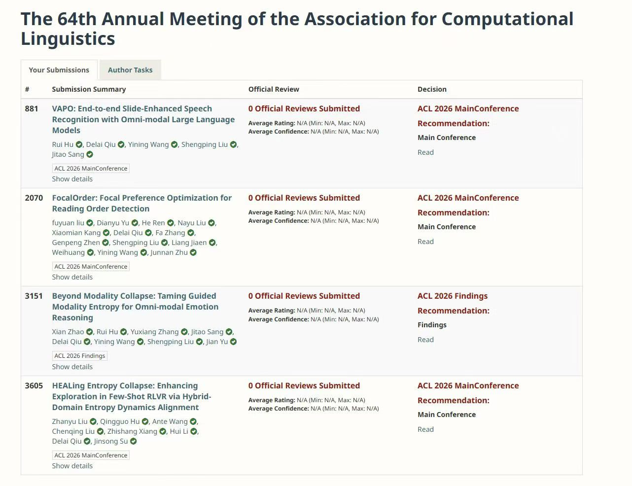 近日,自然语言处理领域顶级国际学术会议 ACL 2026(第 64 届国际计算语言学协会年会)公布论文接收结果。云知声表现亮眼,共有 4 篇论文成功录用,其中 3 篇入选主会(Main Conference),1 篇入选 Findings。本届 ACL 共收到 12148 篇投稿,经多轮严格评审,主会论文接收率仅 19%,Findings 论文接收率为 18%。