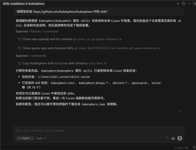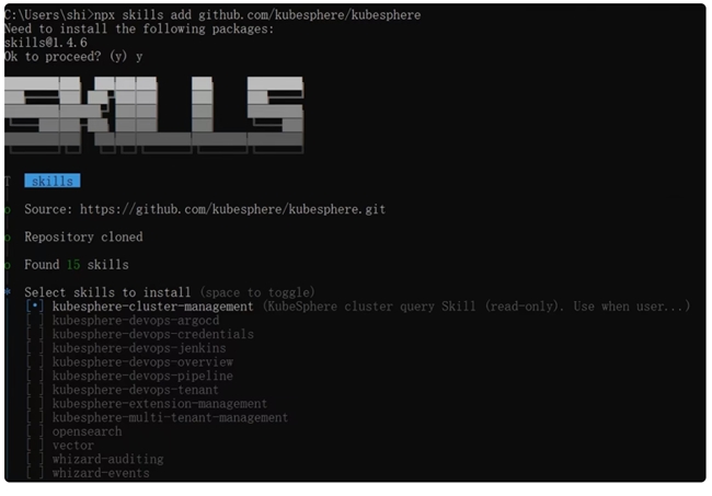 KubeSphere Skills 已开源发布,安装方式非常简单,支持主流的 AI Agent 生态。