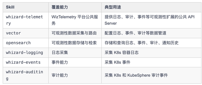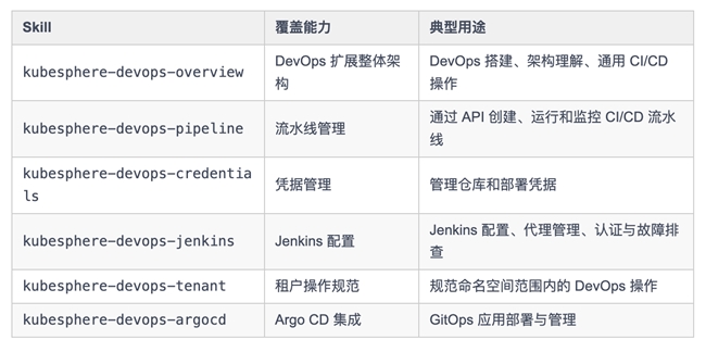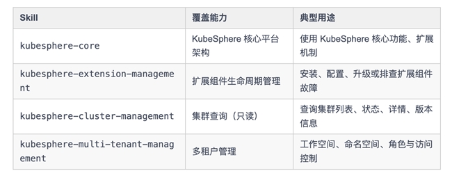 KubeSphere Skills 目前共发布 16 个技能包,覆盖核心平台、DevOps 全流程、可观测性套件三大领域: