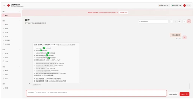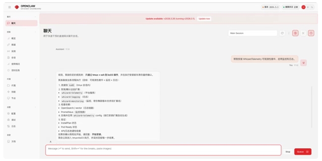 加载 Skill 后,当你告诉它:帮我安装 WhizardTelemetry 可观测性套件,启用监控和日志。
