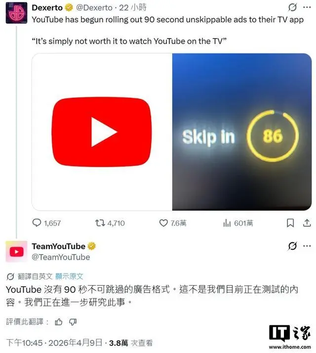 4 月 10 日消息,YouTube 团队昨天在 X 平台发文,回应平台出现“90 秒不可跳过广告”一事。