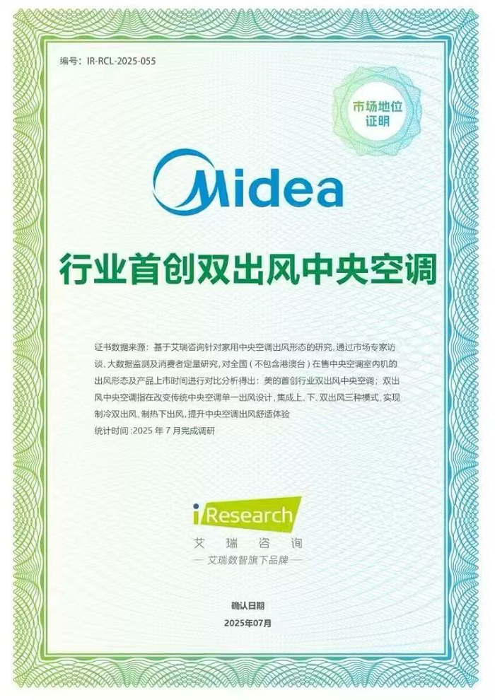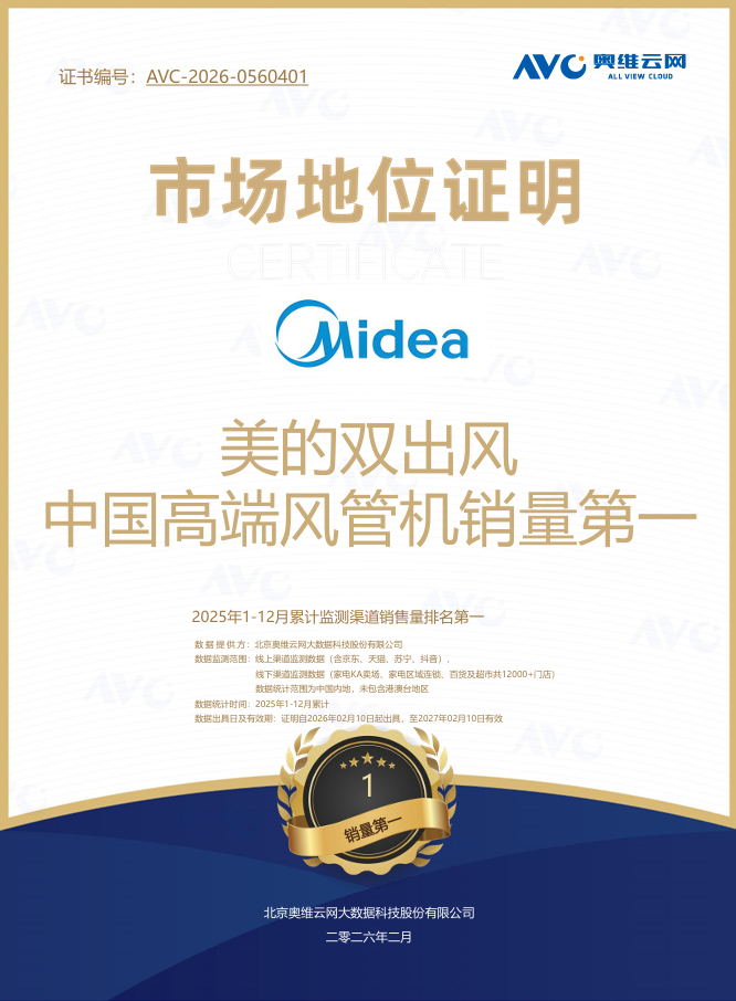 此前,美的双出风风管机已率先赢得市场认可,斩获中国高端风管机销量第一的成绩。从行业首创到市场跑通,美的双出风风管机已经完成了从技术验证到消费验证的跨越。奥维云网市场地位证明显示,2025年1-12月,美的双出风位列中国高端风管机销量第一;与此同时,美的也登顶中国中央空调市场监测销量第一。