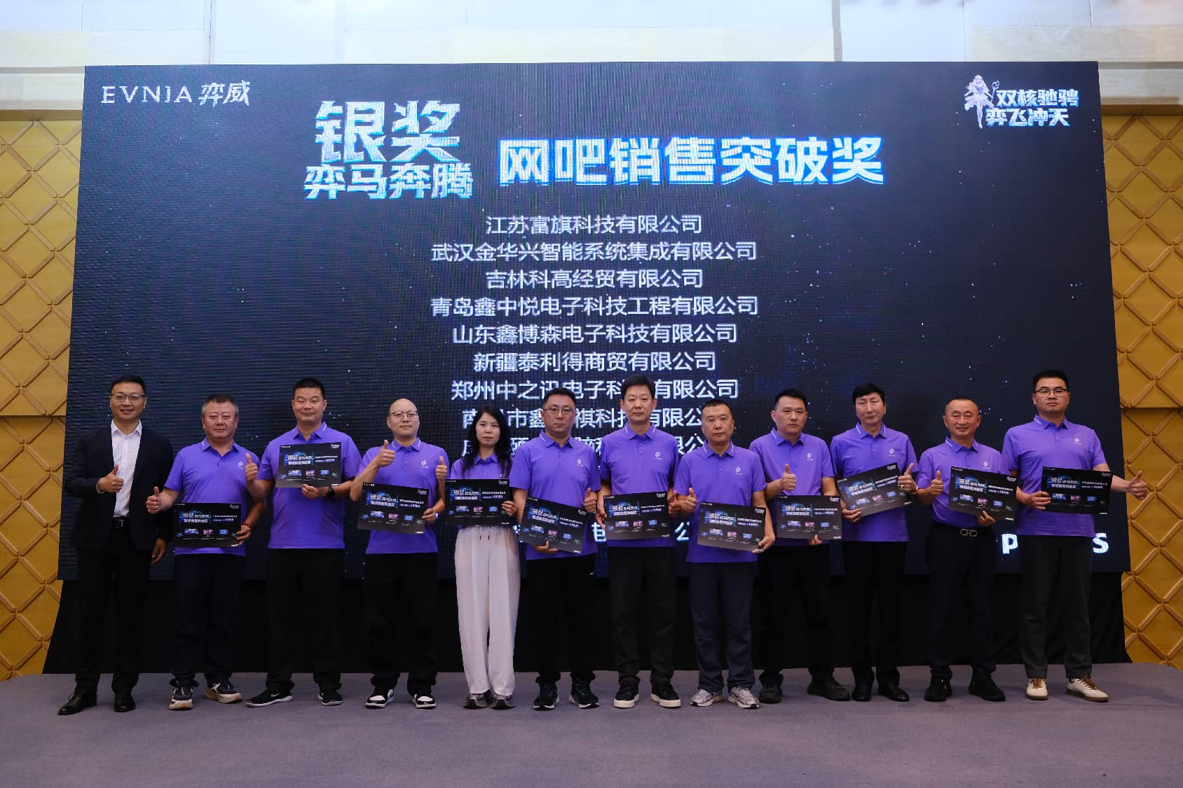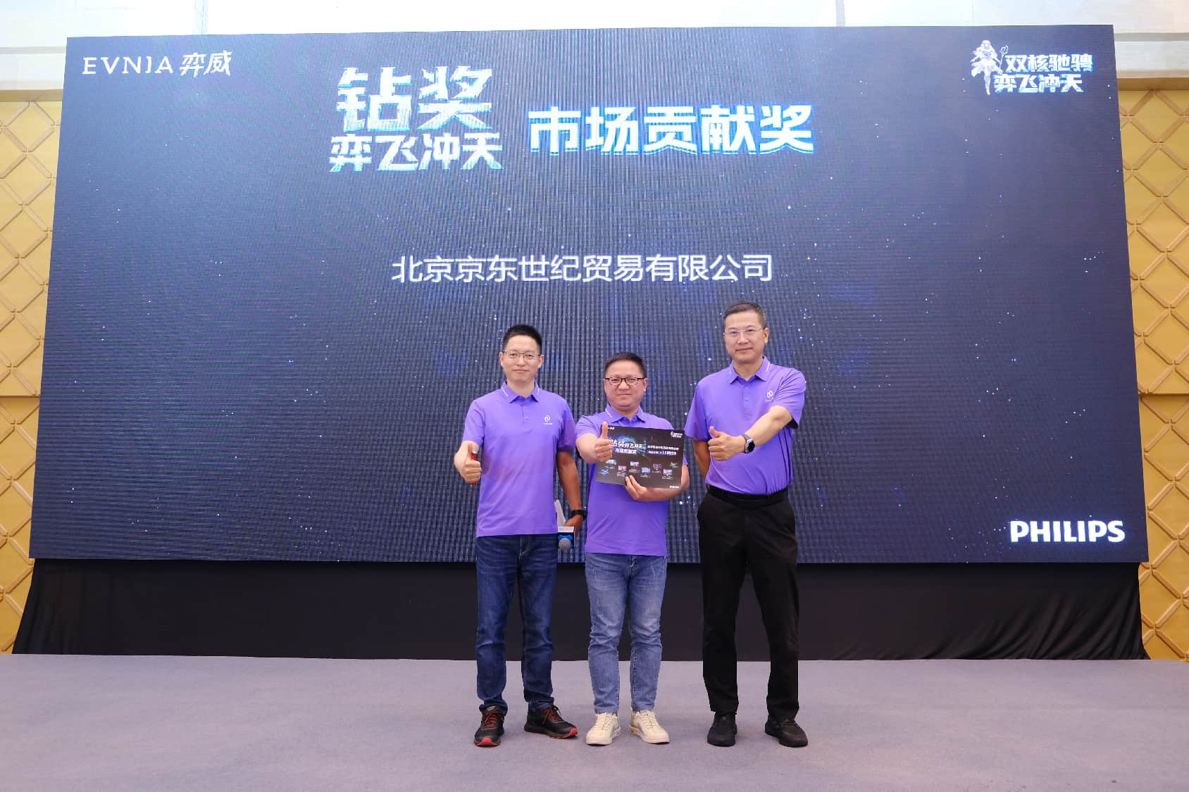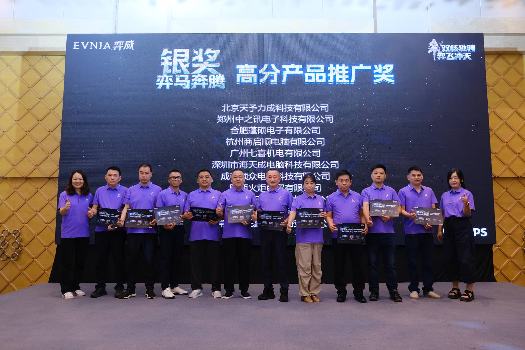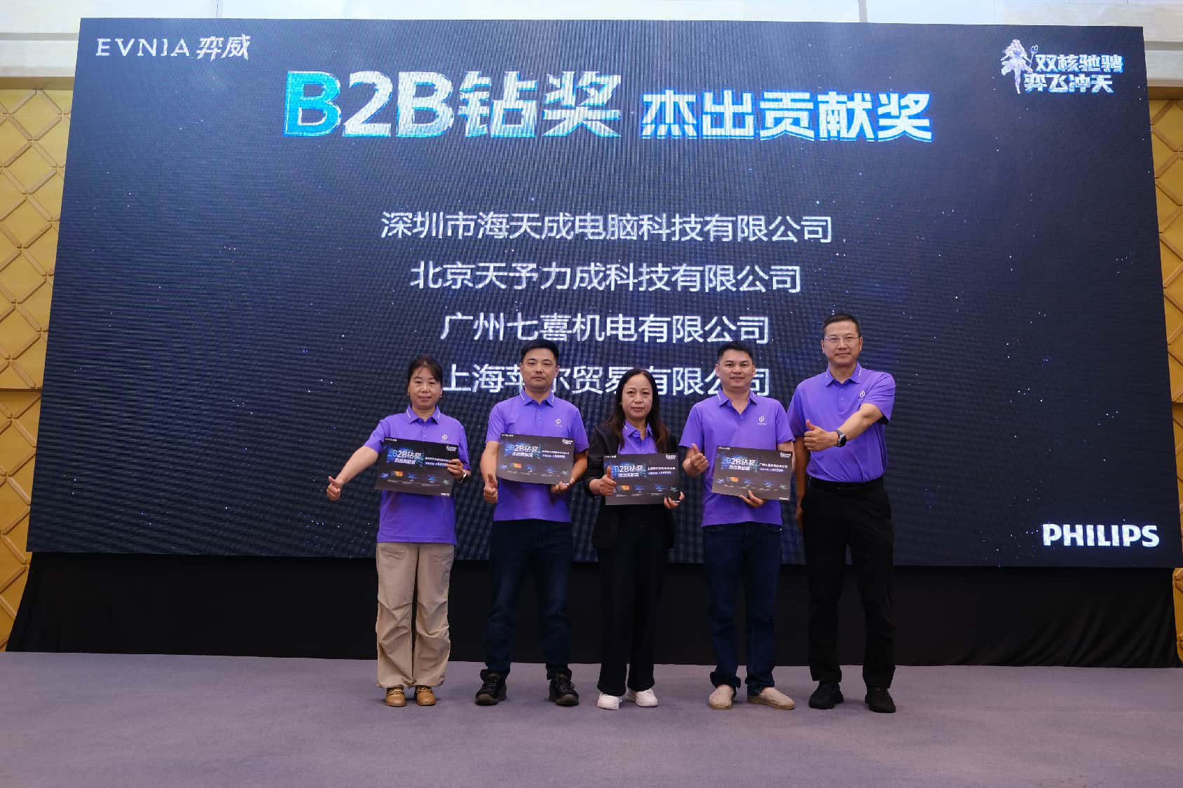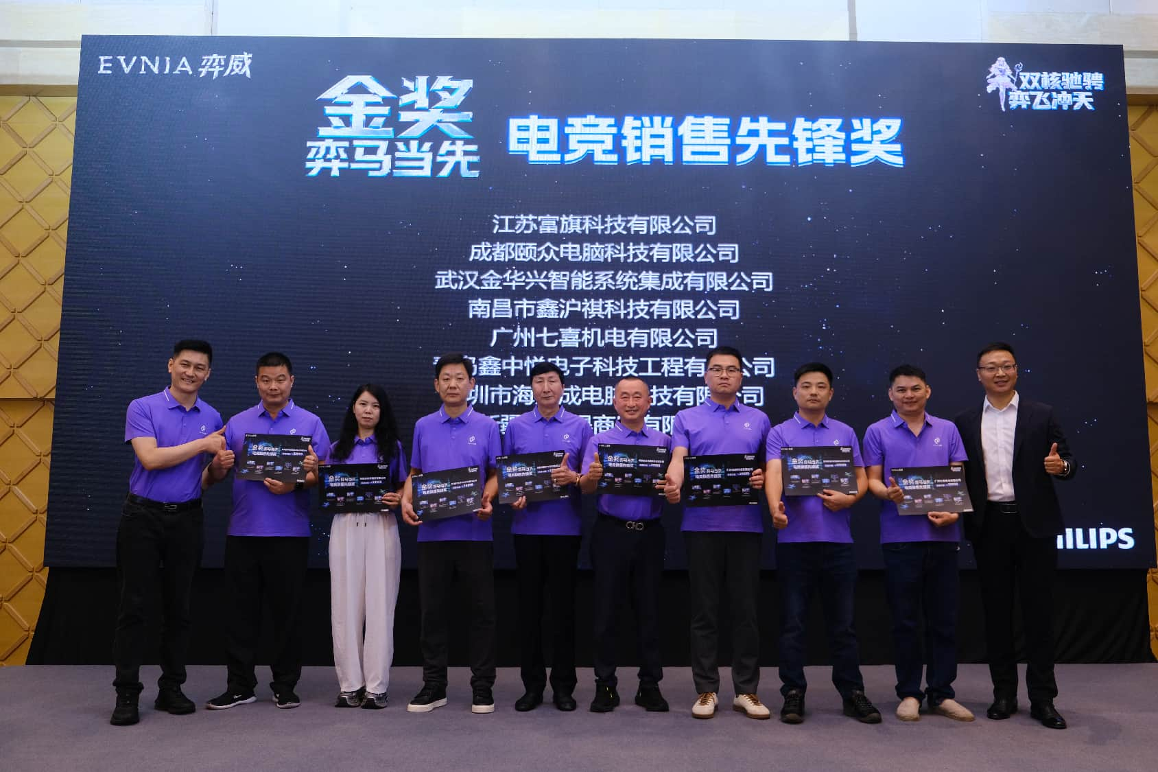 在所有年度策略分享完毕之后,简洁而富有科技感的创意互动仪式,将渠道会的现场气氛推入了高潮。来自飞利浦显示器的三位领导嘉宾阎立东、林为康、于永杰,向大屏幕中的“双E”能量注入了PHILIPS与EVNIA弈威的品牌之力。随后,代表着品牌年轻化策略的EVNIA弈威二次元虚拟形象「弈天使」,与代表着“AI+健康”双核战略的光影飞马一起“弈飞冲天”,引领全体合作伙伴一道,携手开启弈威元年新征程、同心共创双核赋能新辉煌。