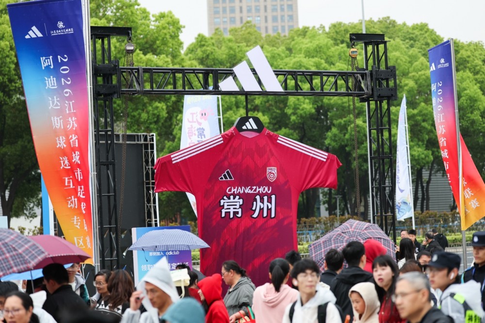 4月11日下午,常州奥体中心体育场外人声鼎沸、欢乐涌动,一众身穿球衣的球迷早早汇聚于此,静待2026江苏省城市足球联赛(以下简称“苏超”)常州队与南通队的揭幕战对决;与此同时,扬州体育公园体育场、无锡宜兴市体育中心体育场、连云港市体育中心体育场外同样热闹非凡,共迎新一届“苏超”开赛;而在各球场外的另一侧,阿迪达斯精心打造的特色展台,成为“苏超”诠释江苏省文旅商体展高质量融合发展的生动缩影。