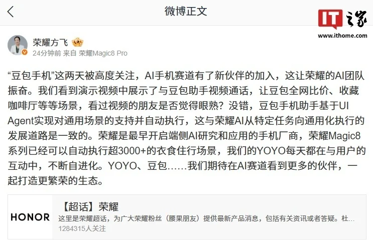 2025 年 12 月,荣耀产品线总裁方飞曾公开力挺豆包手机的技术路径:“豆包手机助手基于 UI Agent 实现对通用场景的支持并自动执行任务,这与荣耀 AI 从特定任务向通用化执行的发展方向是一致的。”