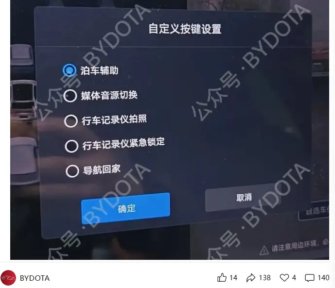4 月 14 日消息,据 BYDOTA 今日透露,比亚迪针对 DiLink 100 智能座舱车型的五视角行车记录仪及哨兵风险视频上传相关功能的适配工作已接近尾声。