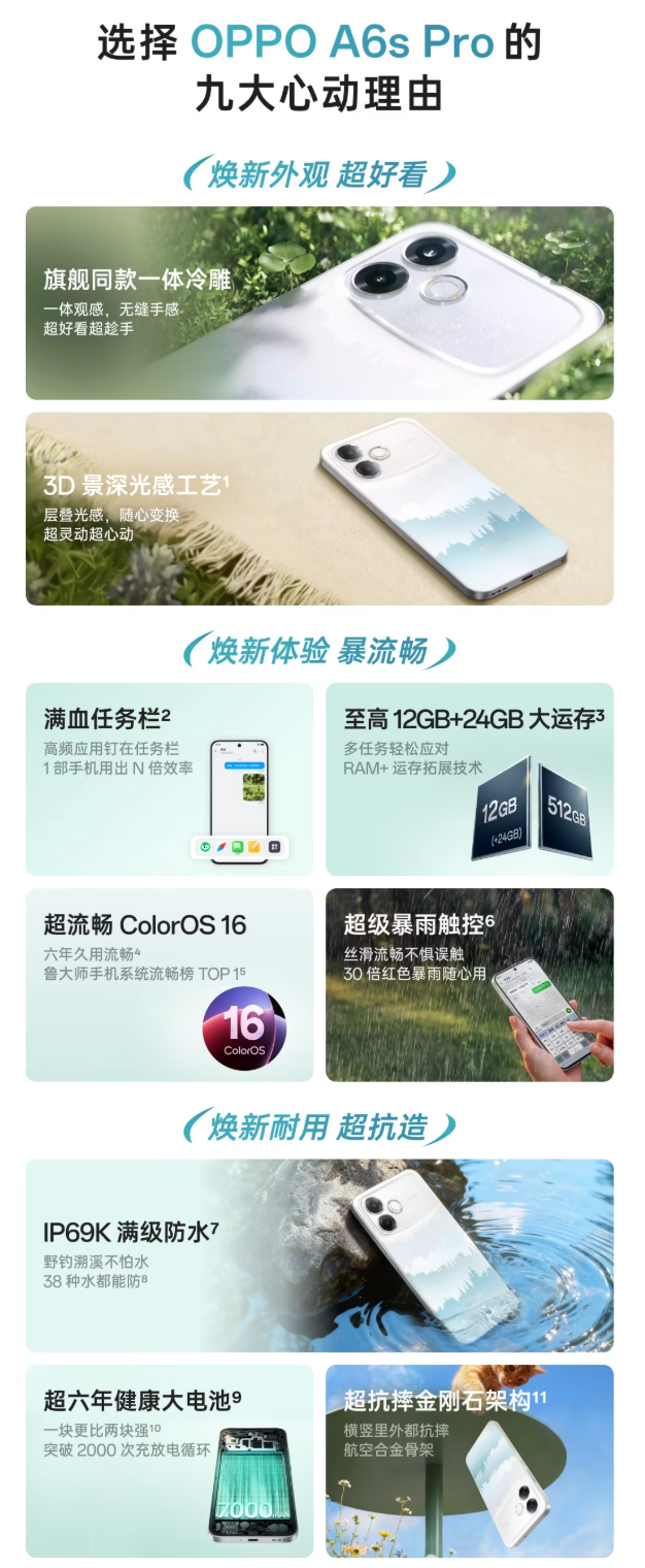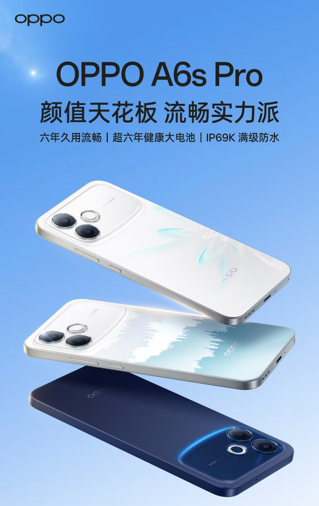 外观上,OPPO A6s Pro延续了A系列一贯的耐用特性,并在防护能力上实现显著升级。配备“超抗摔金刚石架构”,结合加厚晶盾玻璃与内部缓冲结构,有效提升整机抗跌落性能,提供青云直上、好运莲莲、夜月生辉三款配色。同时,OPPO A6s Pro支持IP69K、IP68、IP66全等级防水防尘,可抵御38种常见液体侵袭,日常泼溅、落水无需担忧。摄影方面,OPPO A6s Pro后置5000万像素广角主摄,辅以200万像素黑白摄像头,支持多种拍摄模式和功能,前置1600万像素摄像头,可满足用户自拍和视频通话的需求。