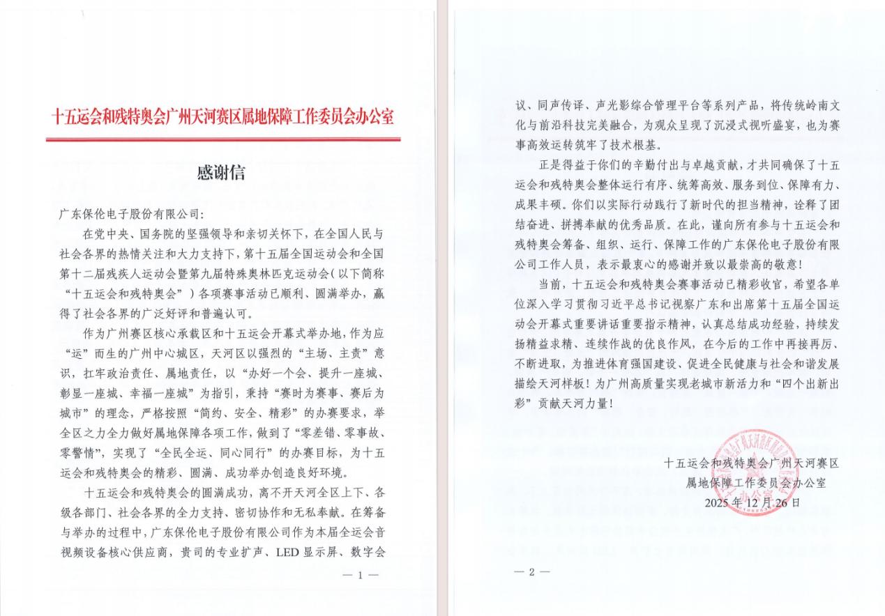 在十五运圆满落幕后,第十五届全国运动会组织委员会办公室特别致信itc,对公司在赛事期间提供的全方位技术支撑与保障服务表示高度赞扬与衷心感谢。