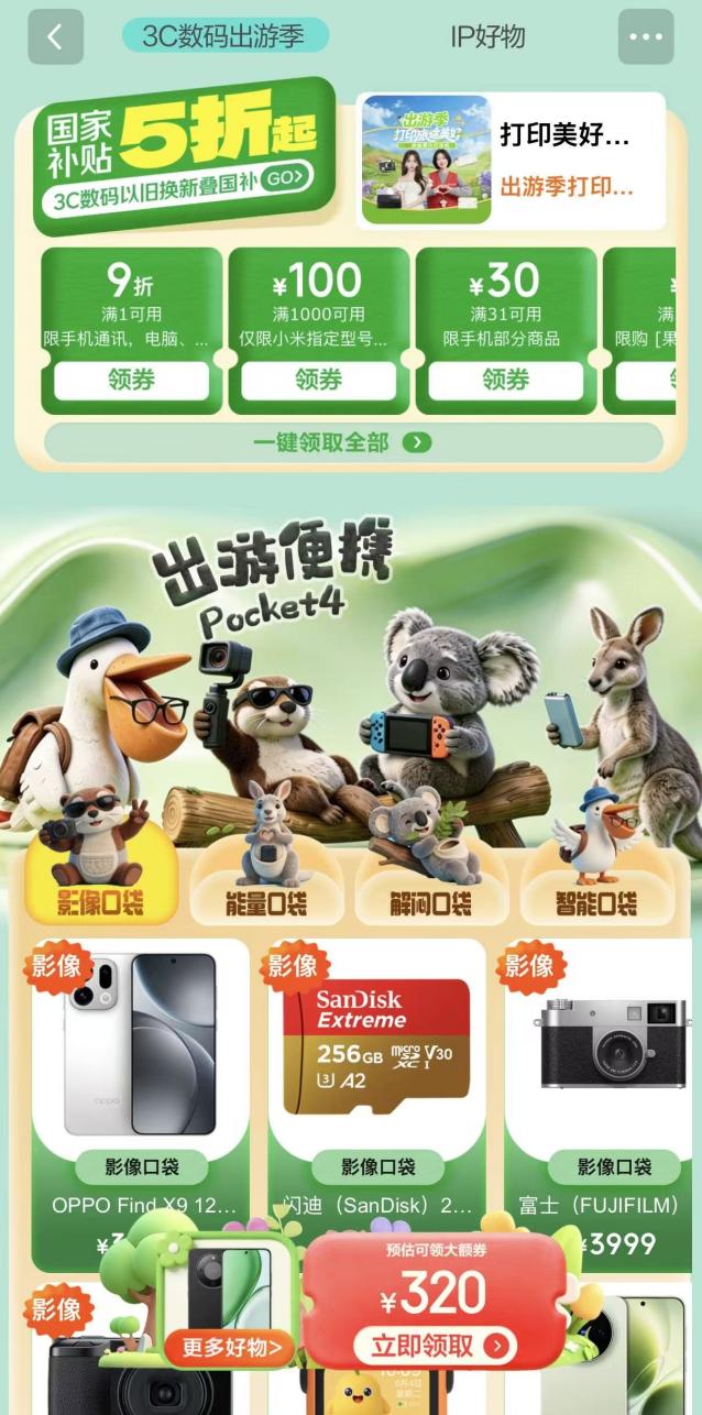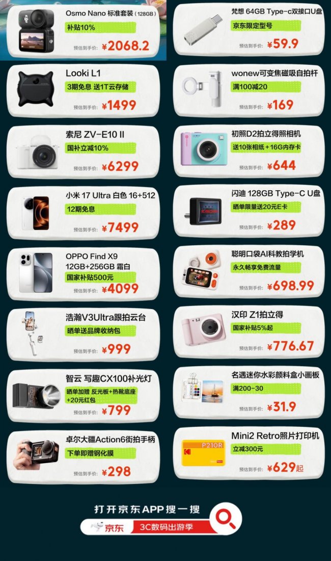 本次“3C数码出游季”还集结更多爆款好物,覆盖从专业创作到轻松记录的多元需求。大疆Osmo Nano标准套装补贴后仅2068.2元,轻巧便携,随手开拍即出片,是口袋级Vlog优选;OPPO Find X9、小米17 Ultra等影像旗舰同样参与国补与免息,满足一机走天下的记录需求。进阶玩家可关注索尼ZV-E10 II、富士xhalf等微单机型,解锁更高画质创作;而初照D2、汉印Z1、Mini2 Retro照片打印机等产品,则为旅途增添即拍即打的趣味体验。与此同时,浩瀚V3 Ultra跟拍云台、智云写趣CX100补光灯等辅助设备全面提升拍摄表现,金士顿、梵想等多规格存储产品也同步覆盖,让素材记录与备份更加从容。更有聪明口袋AI科教拍学机、名遇水彩颜料盒等创意单品加持,从记录到分享,从影像到创作,一站式满足出游灵感表达。