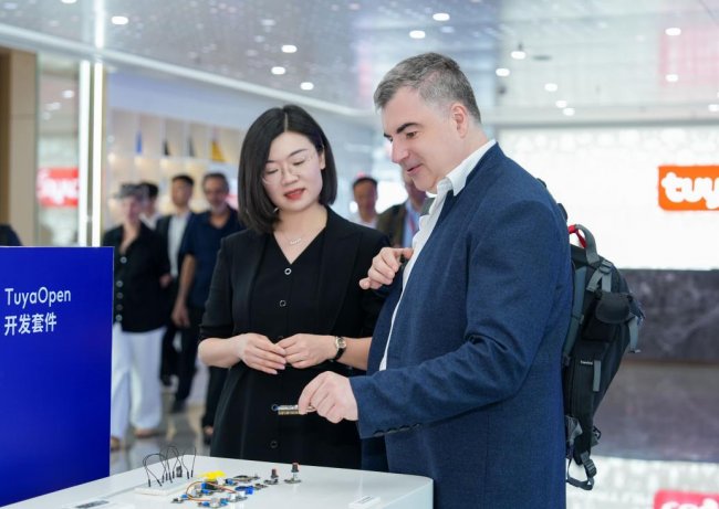 在展厅参访过程中,来访嘉宾详细了解了涂鸦的发展历程、全球化成果,以及在AI+IoT、Physical AI以及云计算等领域的技术和生态布局。