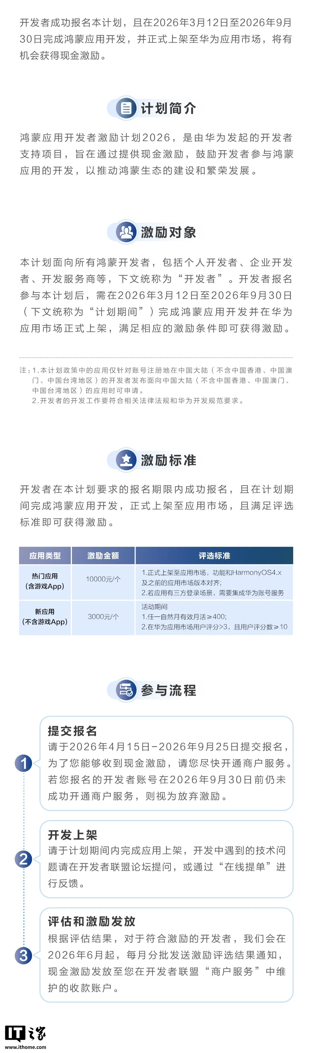 本计划面向所有鸿蒙开发者,包括个人开发者、企业开发者、开发服务商等,下文统称为“开发者”。开发者报名参与本计划后,需在 2026 年 3 月 12 日至 2026 年 9 月 30 日(下文统称为“计划期间”)完成鸿蒙应用开发并在华为应用市场正式上架,满足相应的激励条件即可获得激励。