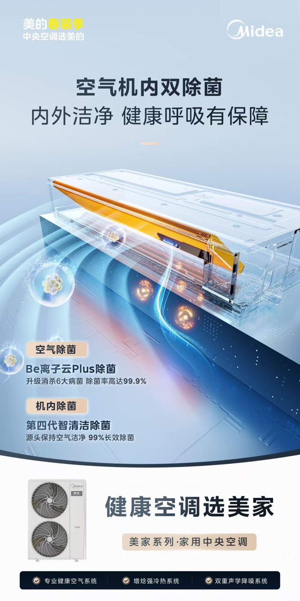 美享家支持全屋家电一屏联动,下单即送智能语音全彩触控屏。无论调节温度、切换模式,还是联动新风、加湿,一句话的事。从此,中央空调不再是孤立的设备,而是全屋空气的智能入口。美享家还搭载Be离子云Plus除菌技术,对甲型H1N1、大肠杆菌等6种主流病菌除菌率高达99.9%。同时内机采用第四代智清洁技术,56℃高温蒸汽深度自清洁,去除翅片上的灰尘、病毒和细菌。从全屋空气到空调内部,双重防线让母婴家庭、敏感人群也能安心呼吸。