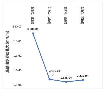 在性能端,初始界面张力为 0.350 mN/m,仅经过 1 轮强化迭代,就直接降至 2.46×10⁻⁴ mN/m,性能提升超过 1400 倍;后续再经过 2 轮迭代,持续优化至 1.63×10⁻⁴ mN/m,最终稳定在 2.22×10⁻⁴ mN/m,全程保持在 10⁻⁴ mN/m 级超低界面张力区间,满足油田化学驱的核心需求。