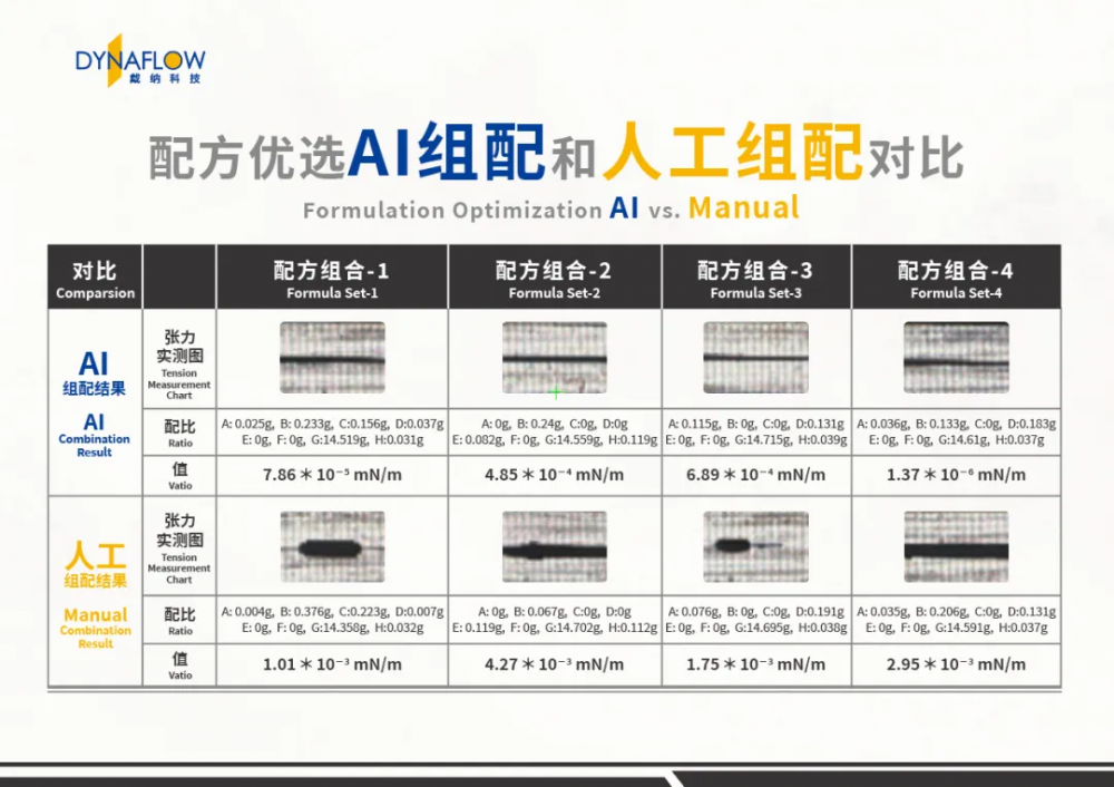 为了验证 AI 组配的真实效果,平台针对 4 组典型配方开展了 AI 组配与人工组配的平行实验。从最关键的性能指标——界面张力来看,AI 组配结果全面领先。