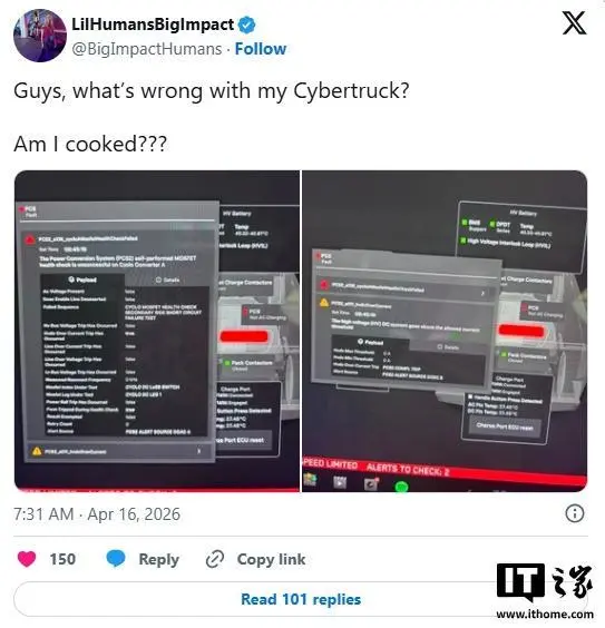 4 月 20 日消息,据 not a tesla app 报道,特斯拉 Cybertruck 车主正面临愈发严重的硬件问题,导致大量车主无法在家为车辆充电。该车的功率转换系统(PCS)出现大面积故障,已成为一大棘手难题,不仅让车辆交流充电功能彻底失效,还让车主面临高昂的脱保维修费用风险。该媒体称,特斯拉应召回 PCS 系统。