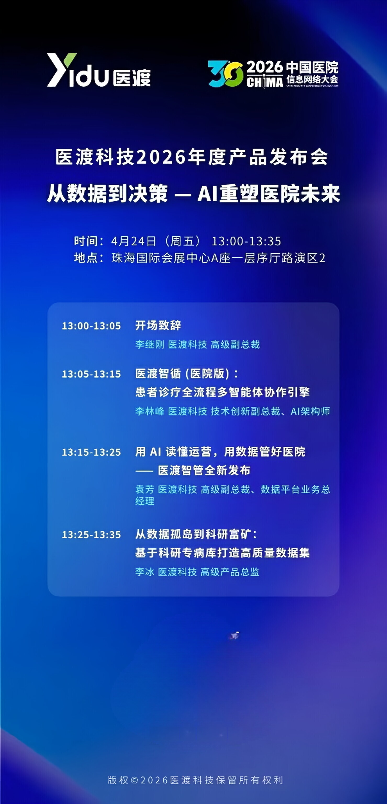 4月24日13:00,珠海国际会展中心A座一层序厅路演区2,国内AI医疗龙头企业医渡科技将举办“从数据到决策——AI重塑医院未来”年度新品发布会。