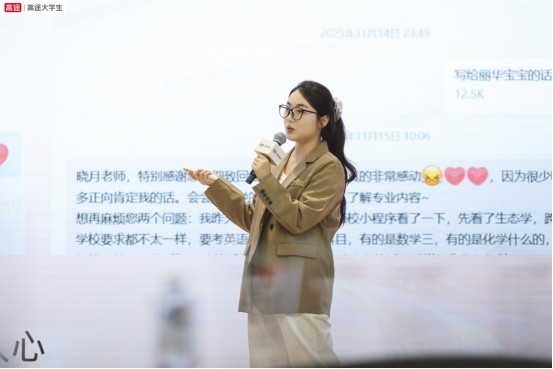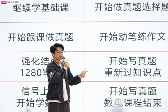 26 高途考研总分王者奖学金获得者郭同学,围绕高途课程的科学规划、技巧赋能、全程陪伴的备考体系展开细致分享。他表示:“高途的二讲老师每天督学,叮嘱我错题本要标注要点、考前要卡点模拟,让我在考场上更加从容应对。” 他建议备考学子择校时目光要长远,提前了解院校特点、复试内容,避开备考误区。