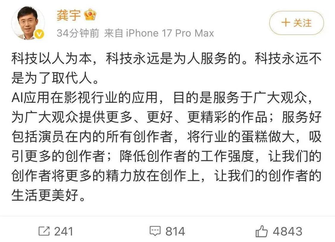 4月21日,爱奇艺创始人、CEO龚宇发文谈AI在影视的应用。他表示:科技以人为本,科技永远是为人服务的。科技永远不是为了取代人。AI应用在影视行业的应用,目的是服务于广大观众,为广大观众提供更多、更好、更精彩的作品;服务好包括演员在内的所有创作者,将行业的蛋糕做大,吸引更多的创作者;降低创作者的工作强度,让我们的创作者将更多的精力放在创作上,让我们的创作者的生活更美好。