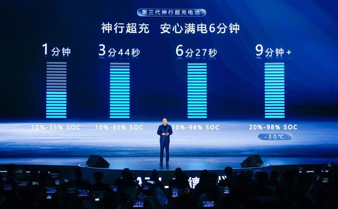 第三代神行超充电池实现等效10C、峰值15C充电倍率,10%至35% SOC耗时1分钟,10%至80% SOC耗时3分44秒,10%至98% SOC耗时6分27秒;零下30℃环境下20%至98% SOC约9分钟,配合电池自加热技术和超换一体网络,低温超充不挑桩。循环1000次后容量保持率超90%。通过降产热、强散热、提精度三大手段实现超充与长寿命兼容。