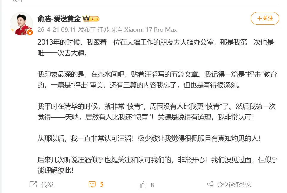 4月21日,追觅科技创始人俞浩今日通过社交平台发文,首次公开谈及对大疆创始人汪滔的评价。