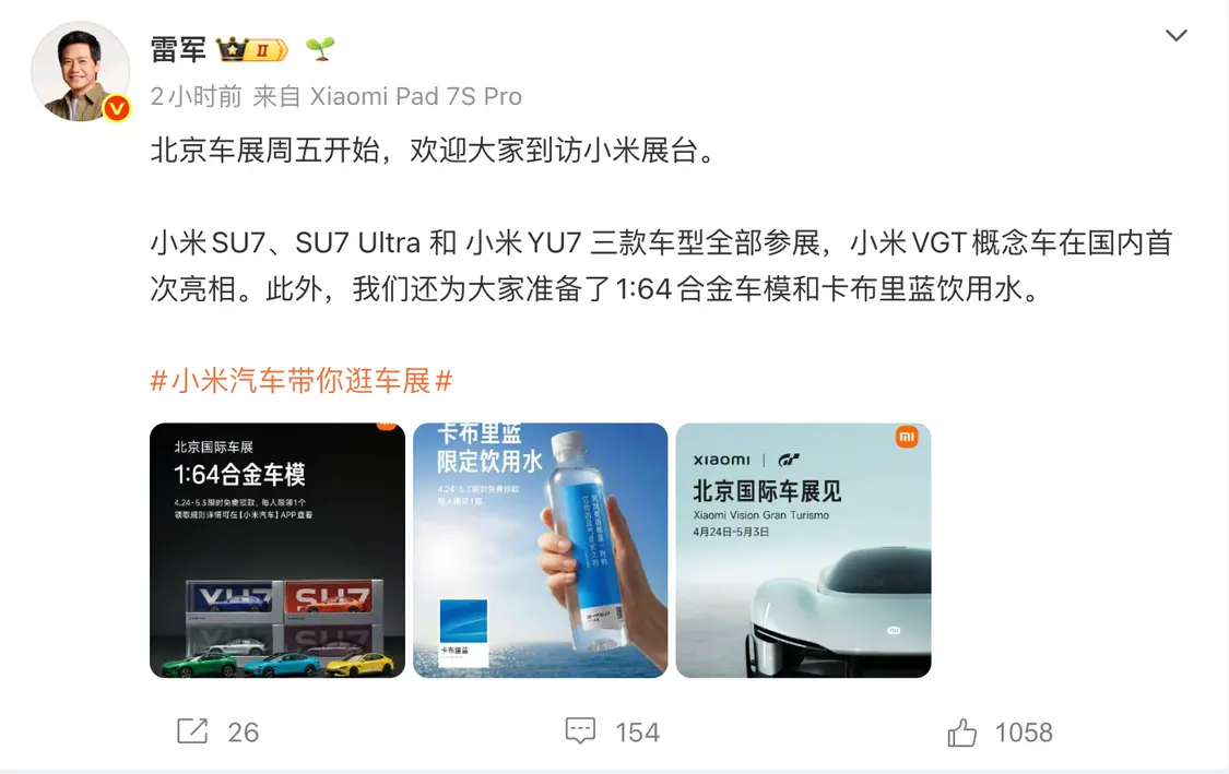 4月22日,雷军发文公布了2026北京车展小米汽车阵容,小米SU7、SU7 Ultra和小米YU7三款车型将全部参展,同时Xiaomi Vision Gran Turismo也将开启国内首秀。