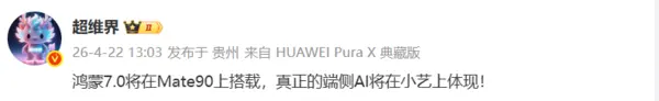 4月22日,数码博主“超维界”透露,鸿蒙操作系统 7.0将在华为Mate90上搭载,真正的端侧AI将在小艺上体现!