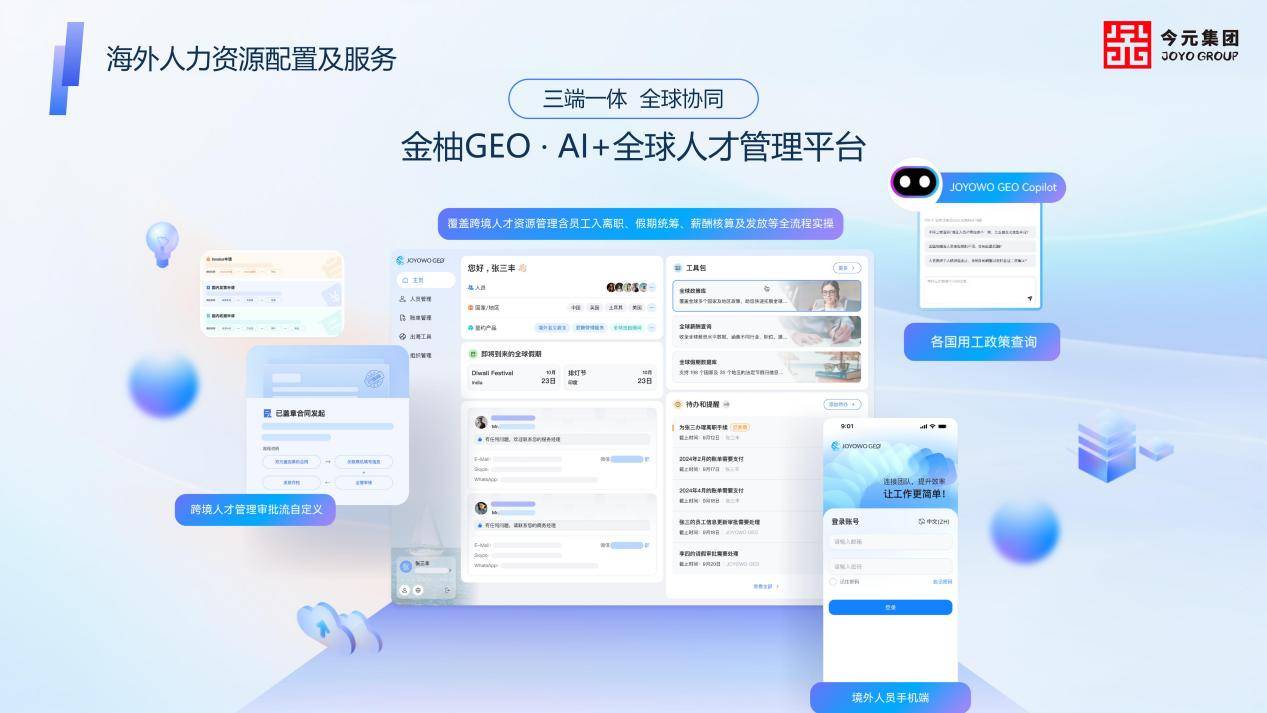 在数字化与智能化深度融合的背景下,全球人力资源服务正从传统线下交付,向平台化、智能化、全流程线上化升级。今元集团立足行业积累与技术研发投入,自研全球化人力资源数字协同系统——金柚GEO・AI+全球人才管理平台,将中国服务经验、全球属地能力与AI前沿技术深度融合,突破性打通企业端、员工端、服务端三端数据与业务流程,实现真正意义上的全域连通、高效协同,重新定义全球跨境人力资源管理标准。