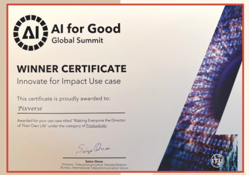 2025年7月,PixVerse 作为首个受邀参加 AI for Good 全球峰会 的AI视频平台,入选官方“创新扩大影响案例集”并获评优秀案例。同年10月,公司加入联合国大学全球人工智能网络。从参与峰会,到成为 AI for Good 全球峰会电影节独家AI合作伙伴,双方在过去一年间不断深化合作,共同探索AI创意表达与社会价值的结合。