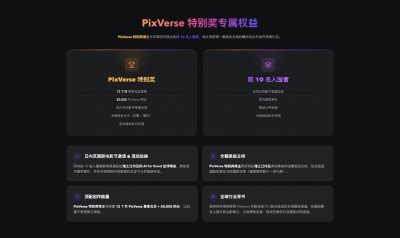 所有入围前 10 名的决赛选手将受邀前往瑞士日内瓦,参加AI for Good 全球峰会官方颁奖典礼。获奖作品将在来自150多个国家的政府代表、国际组织与行业领袖面前展映。与此同时,获奖创作者还将获得 PixVerse 与 ITU 的联合媒体报道,并有机会与国际政策制定者和行业专家交流。优秀创作者将优先获得加入PixVerse 创作者合作伙伴计划(CPP)的资格。