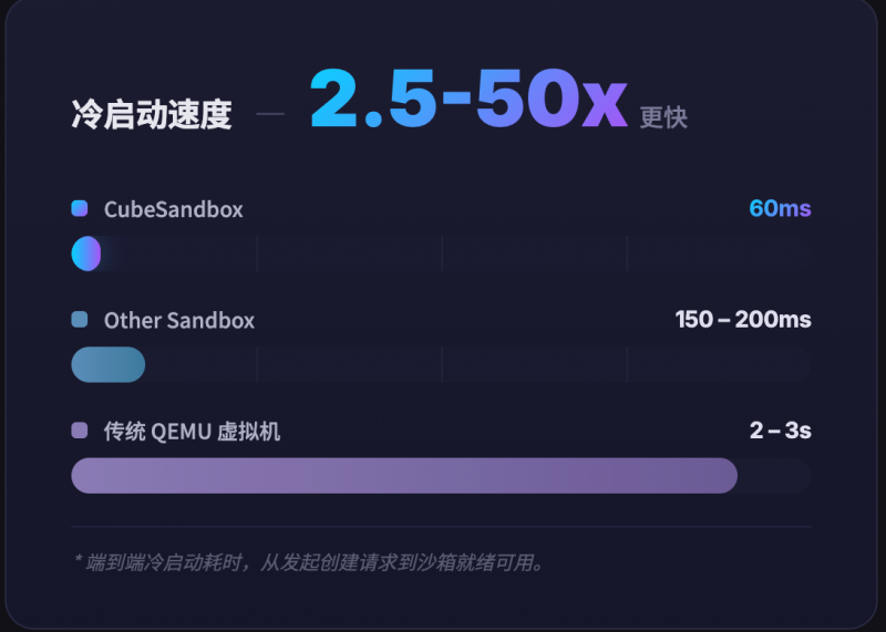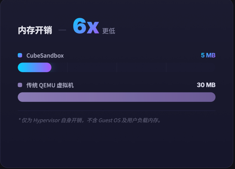 单实例内存开销<5MB,通过CoW内存复用、Rust底层极致裁剪、reflink磁盘共享技术,单台96vCPU物理机可运行2000+沙箱,存储消耗较传统方案降低90%+,算力成本大幅下降。