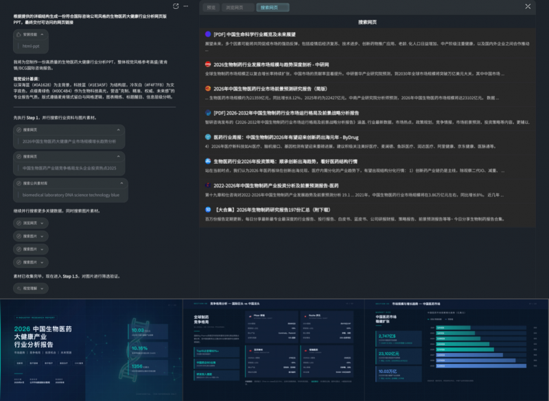 后段: 通过HTML报告与PDF、PPT生成技术,将研究成果转化为最终的视觉呈现。