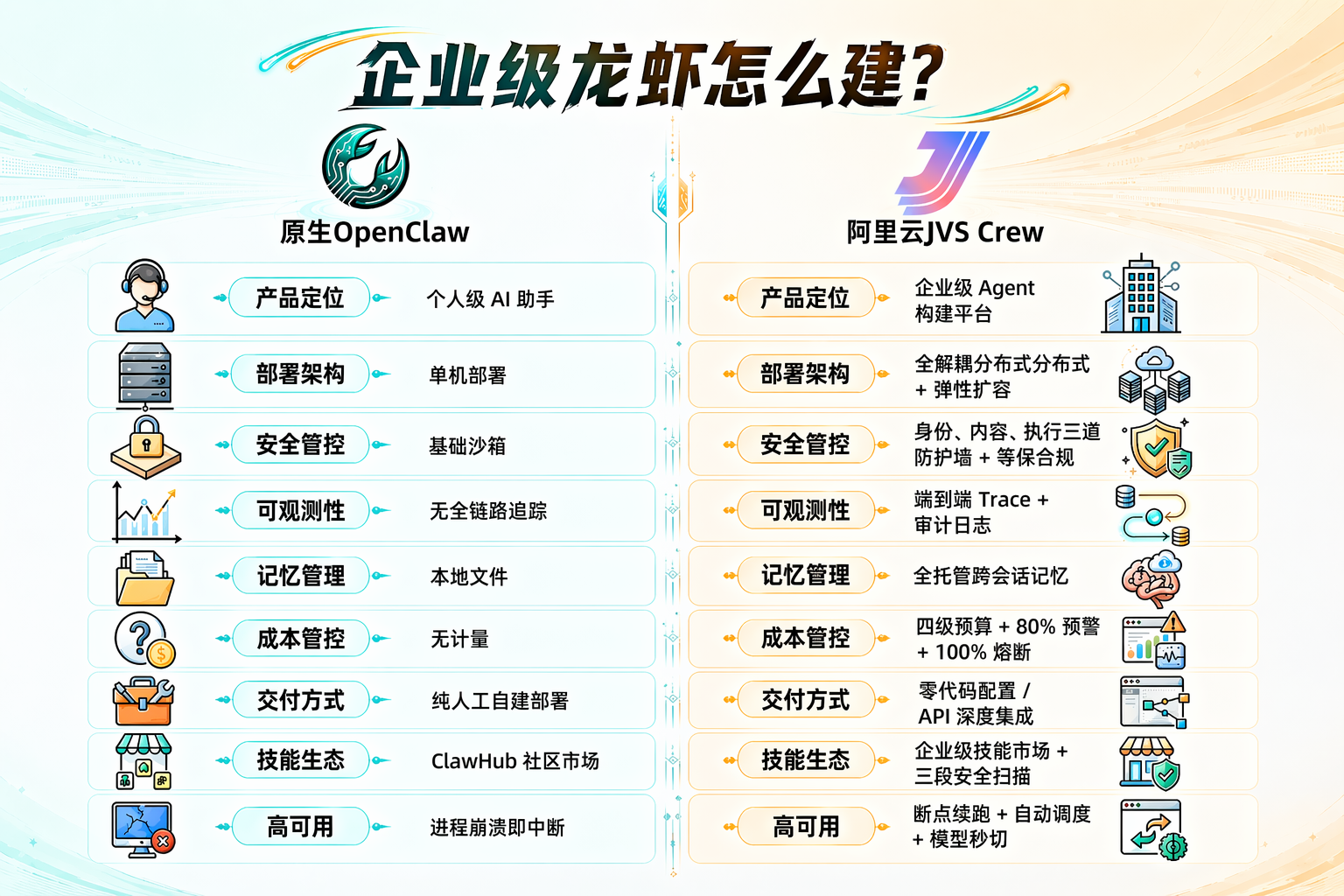 阿里云JVS Crew要解决的,正是这个“从玩具到工具”的鸿沟——补齐OpenClaw在企业级安全性、稳定性和合规性上的短板,依托阿里云十多年沉淀的企业级基础设施,让开发者把全部精力聚焦在如何让Agent“更聪明”上。