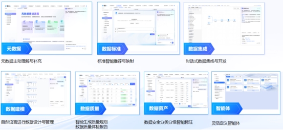 建模与标准层涵盖三项能力:智能数据建模通过语义化建模与文档解析,自动提取关键要素生成数据体系框架;智能元数据补充依托大模型自动识别并填充元数据属性,完成规范化录入与智能校验;数据标准智能推荐则能深度解析业务需求与行业规范,自动生成标准并支持一键落标,从根本上统一数据口径,替代大量人工比对工作。