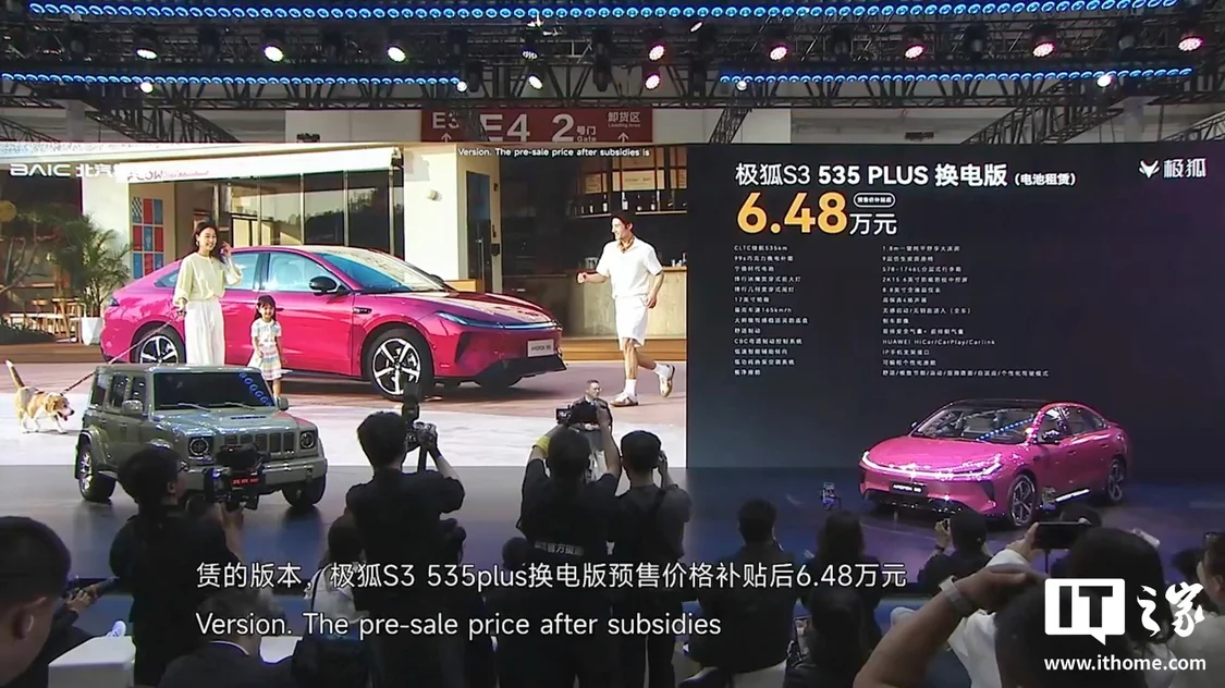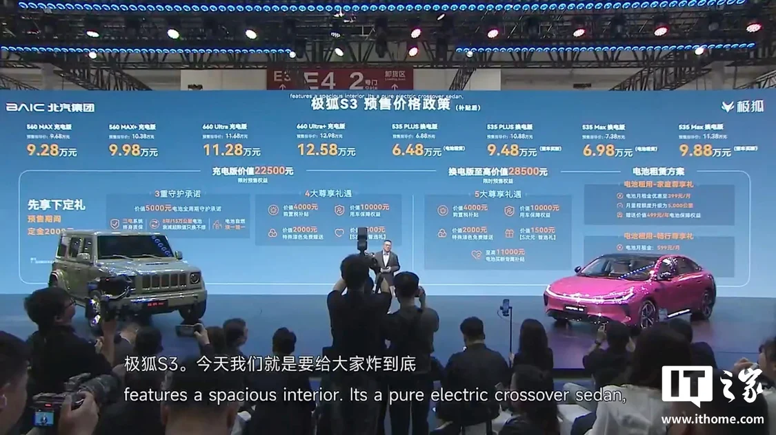 4 月 24 日消息,北汽新能源旗下极狐汽车今日在 2026 北京车展举行发布会,极狐 S3 正式开启预售,电池租赁 6.48 万元起: