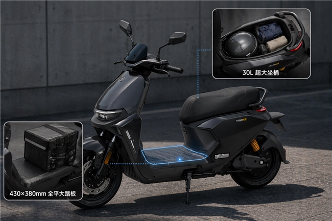 九号 M3 95c MAX 闪骑版把这些细节都考虑到了:30L 超大坐桶,能轻松放下雨具、工具和备用物品,不用再到处乱塞;430×380mm 全平大踏板,不仅能稳稳承载外卖箱,临时放个包裹、外卖袋也很方便,实用性拉满。