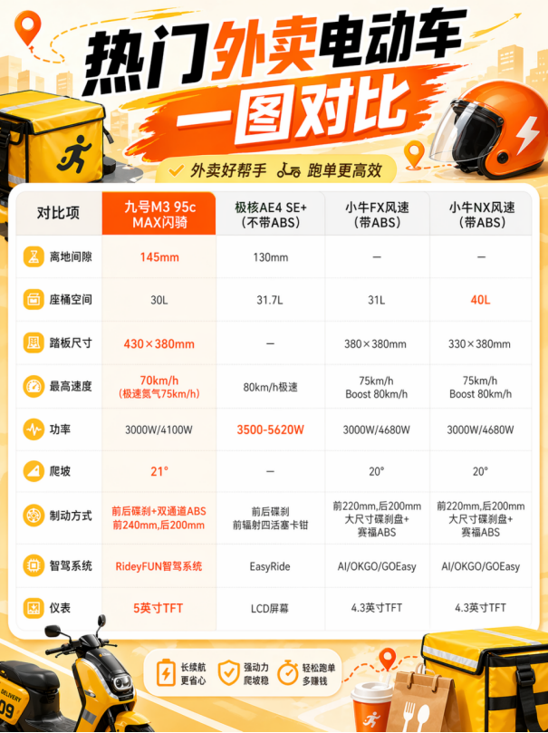 送外卖选车,核心就看 “实用” 二字。九号 M3 95c MAX 闪骑版,不玩虚的参数游戏,只聚焦骑手的真实需求,解决跑单路上的各种痛点。选它,就是选一台能陪你稳稳赚钱、靠谱省心的伙伴。跑单要高效,就选九号闪骑家族!