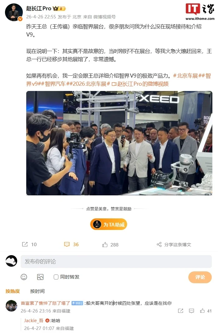 4 月 27 日消息,智界汽车执行董事及执行副总裁赵长江昨晚发文回应了王传福(比亚迪董事长兼总裁)亲临智界展台,为何自己没在现场接待和介绍 V9。他表示: