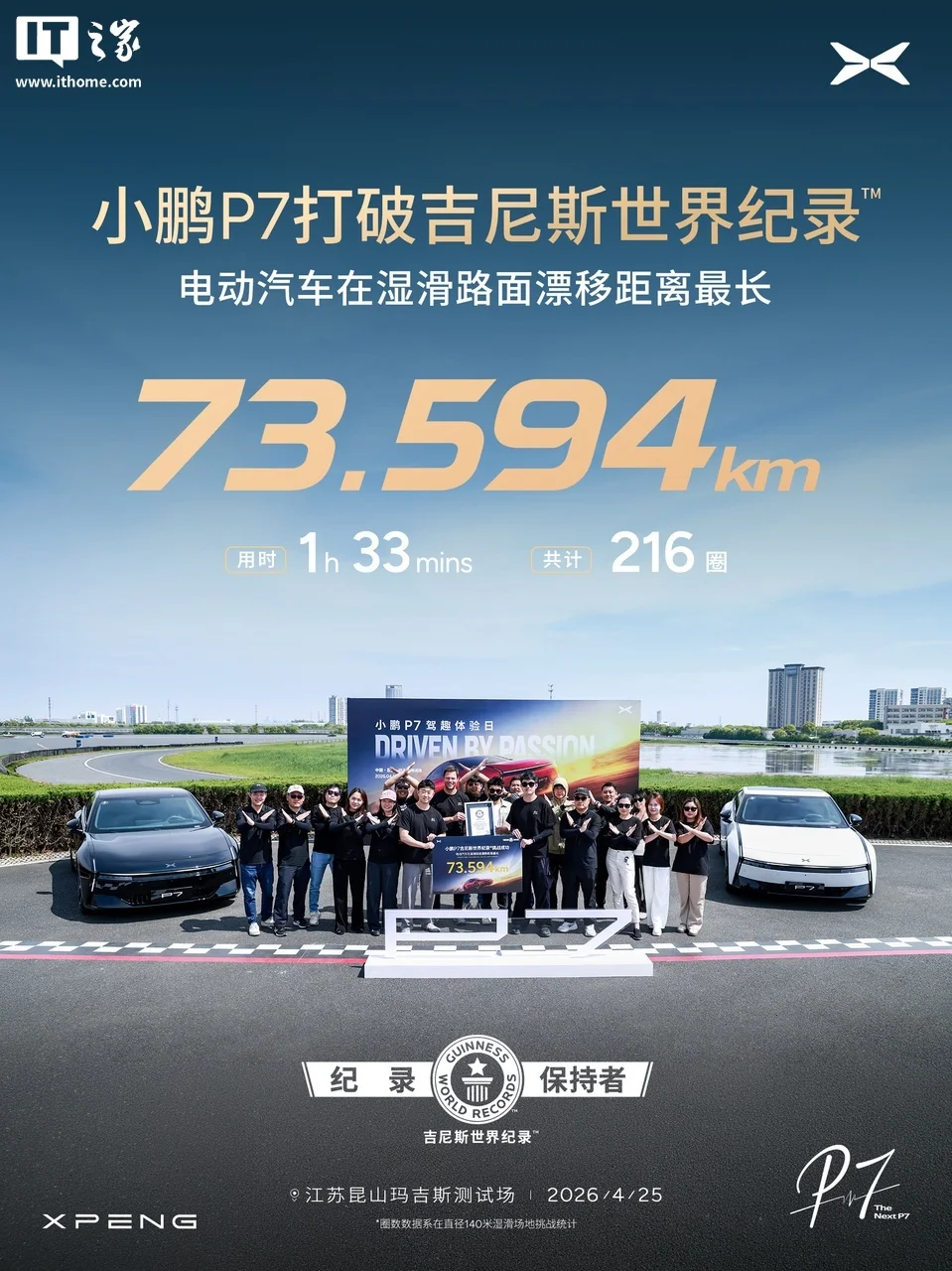 4 月 27 日消息,小鹏汽车官方刚刚宣布,小鹏 P7 打破了电动汽车在湿滑路面漂移距离最长吉尼斯世界纪录:距离 73.594 km、用时 1h33mins、共计 216 圈。