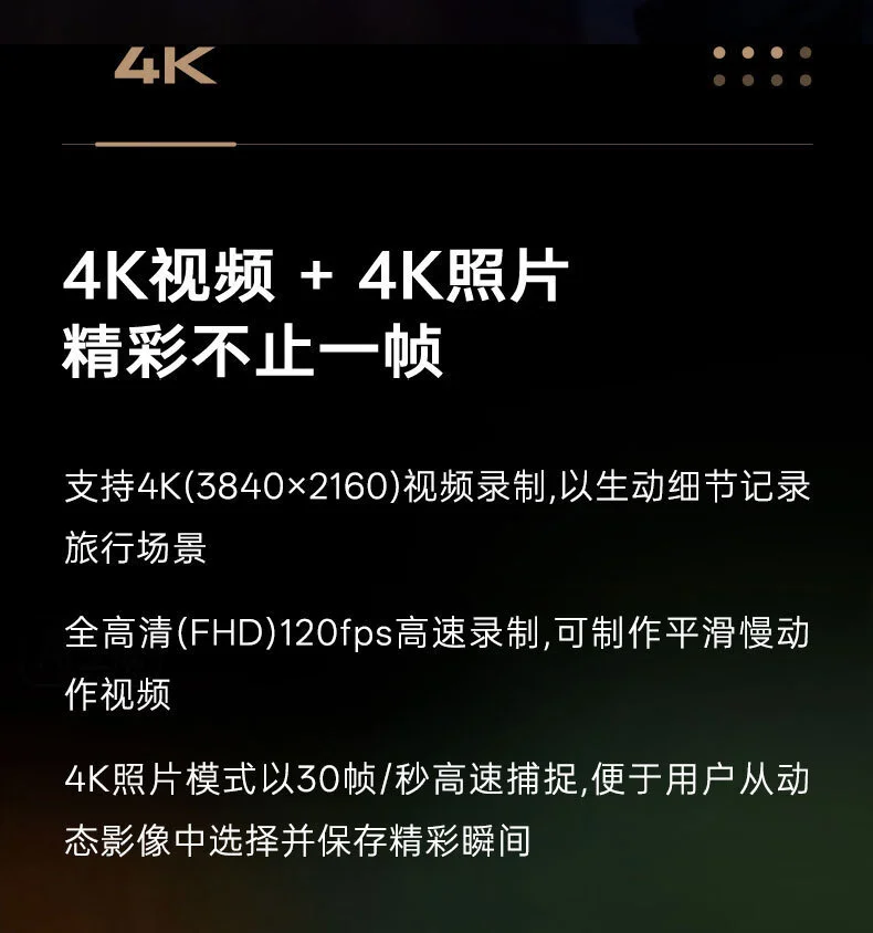 松下 LUMIX ZS300 相机可拍摄 4K 视频,4K 照片模式能以 30 帧 / 秒高速捕捉,还支持 FHD 120fps 高速录制。