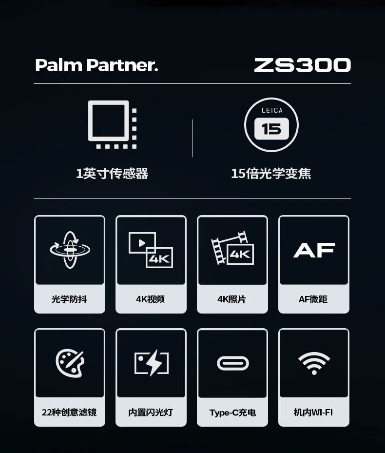 松下 LUMIX ZS300 相机搭载 1 英寸 CMOS 传感器,有效像素约 2010 万;搭载徕卡认证 15 倍光学变焦(等效 24-360mm),最近对焦距离可达 3 厘米,支持 5 轴混合防抖技术。