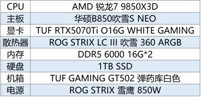 首先为大家推荐一套颜值与性能并存的白色海景房主机,以华硕ROG B850吹雪S NEO主板为核心,搭配AMD锐龙7 9850X3D处理器、华硕TUF RTX5070Ti O16G WHITE GAMING显卡等令人心动的电竞装备,可高画质流畅运行各类大作,整机灯效也能带给用户无与伦比的沉浸式游戏体验!