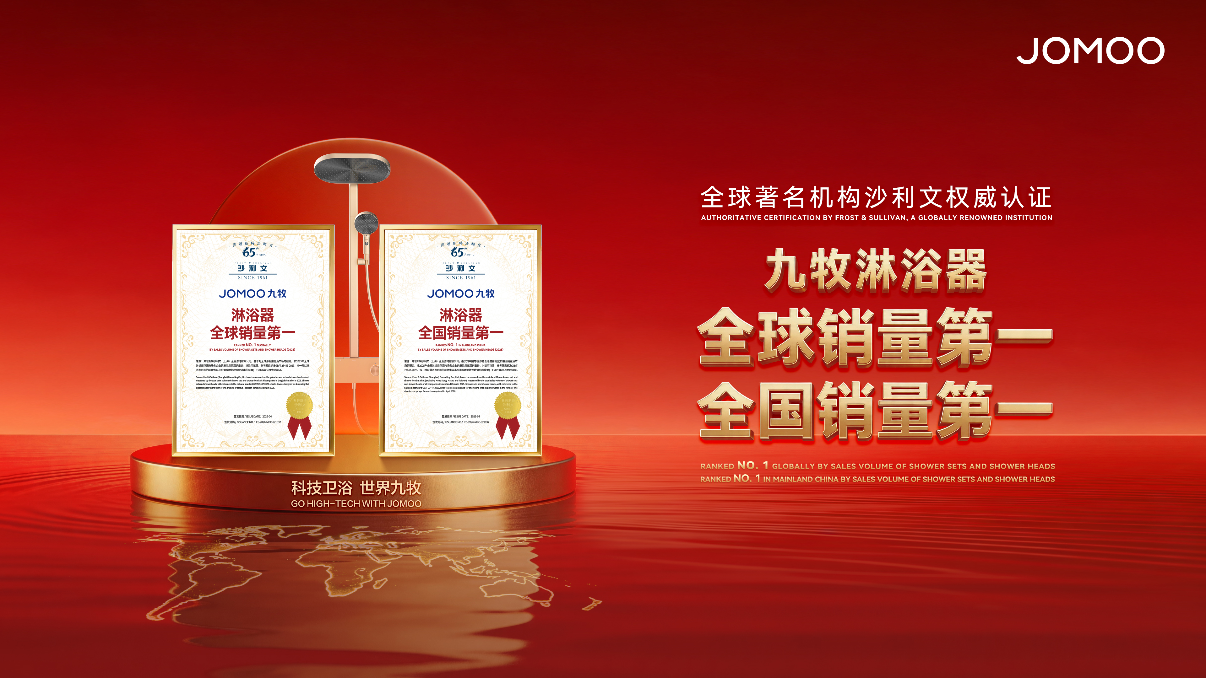 4 月 28 日,全球著名咨询机构弗若斯特沙利文,根据 2025 年全球淋浴用花洒市场各企业的淋浴用花洒销量调研统计,正式认证 “九牧淋浴器全球销量第一”、“九牧淋浴器全国销量第一”。