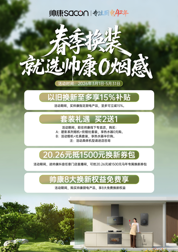 2026春季家装节如约启幕,厨电焕新成为家装核心环节,不少家庭都在寻找省心省力的全套厨电解决方案。深耕厨电领域42年的健康厨电专家帅康,精准契合家庭焕新需求,不仅推出以旧换新至高15%补贴、套系购买赠好礼等重磅优惠,更以烟机、炊烟灶、热水器黄金组合,实现厨电焕新一站式配齐,让家庭无需分头选购,轻松升级品质居家体验。